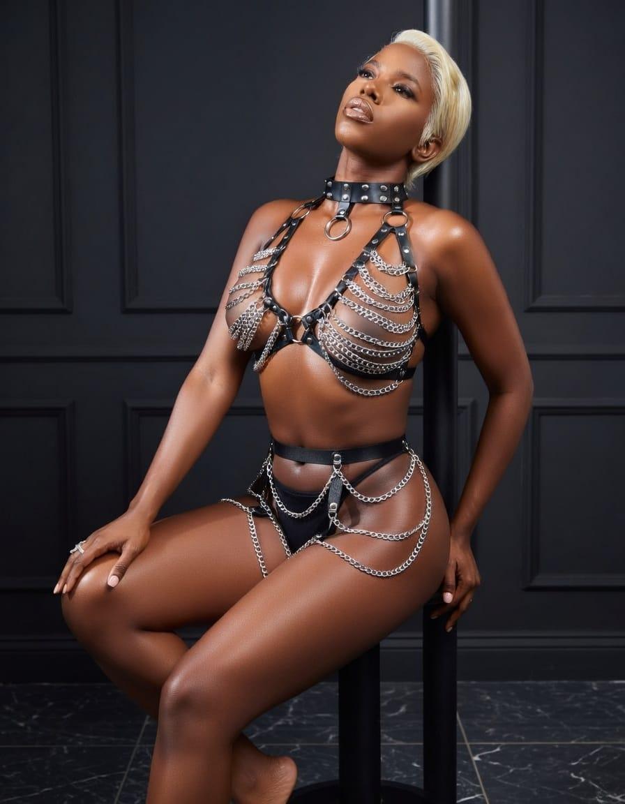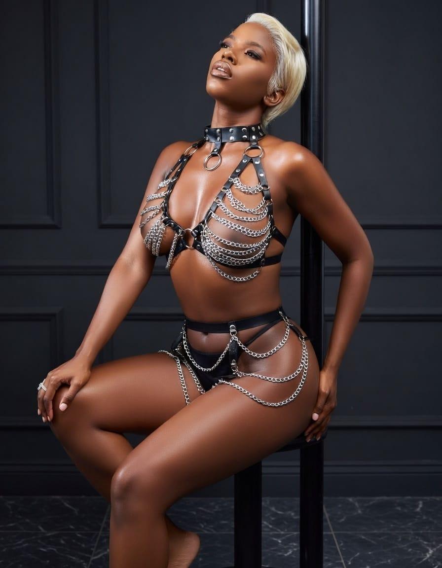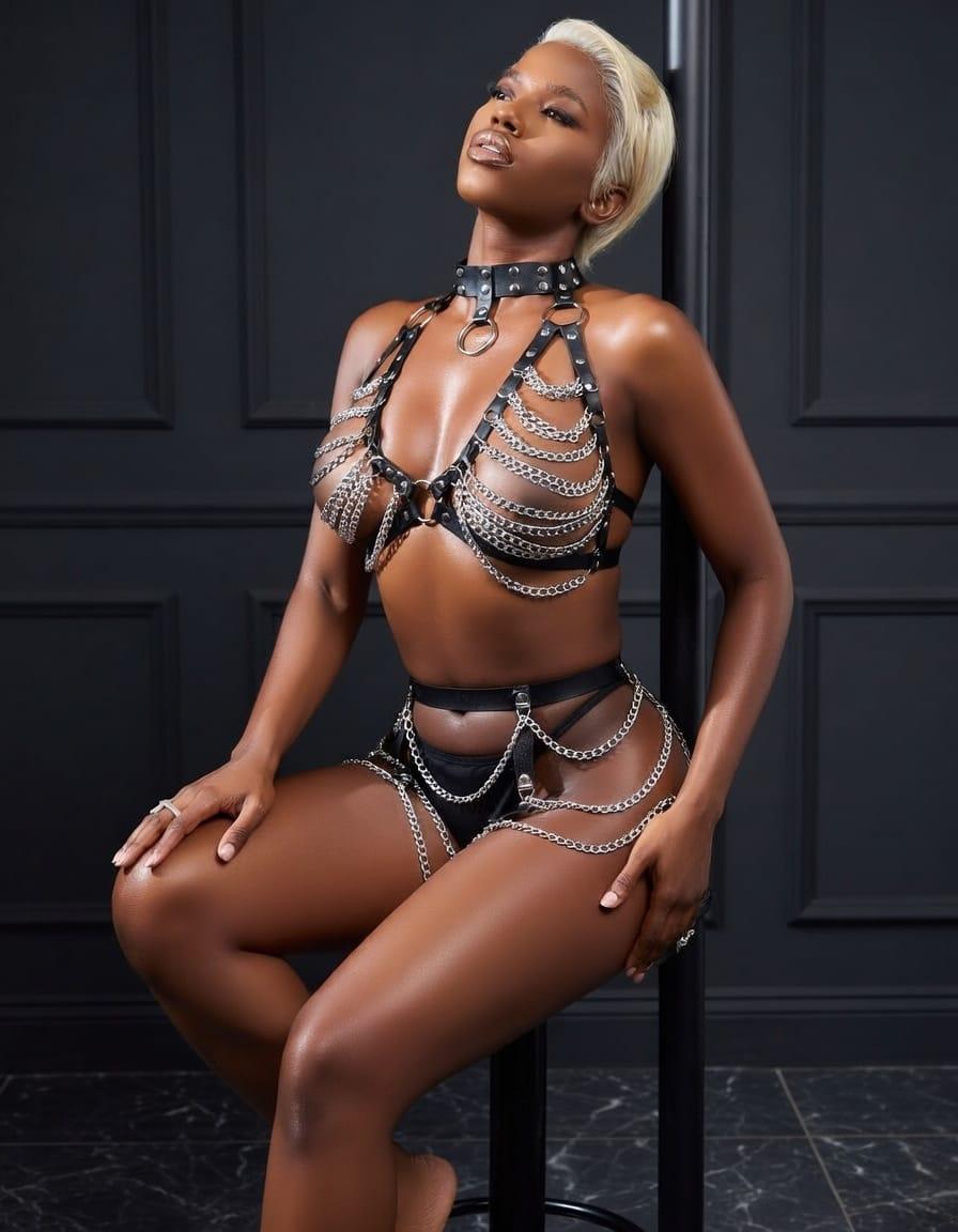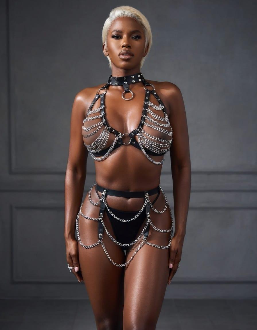Vücudu kusursuz şekilde saran metal zincirlerden ve ayarlanabilir deri kayışlardan oluşan bu özel tasarım fantazi harness, cesur ve iddialı bir görünüm isteyenler için üretildi. Hem fotoğraf çekimlerinde hem özel gecelerde hem de konsept kombinlerde güçlü bir stil sunar.